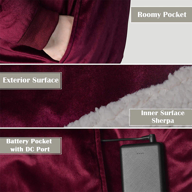 - ONE SIZE FITS ALL - The large, oversized comfortable design is a fit for most all shapes & sizes. Machine washable. Package include 1 * Sherpa Blanket Hoodie, 1* battery pack and 1* WATERPROOF bag