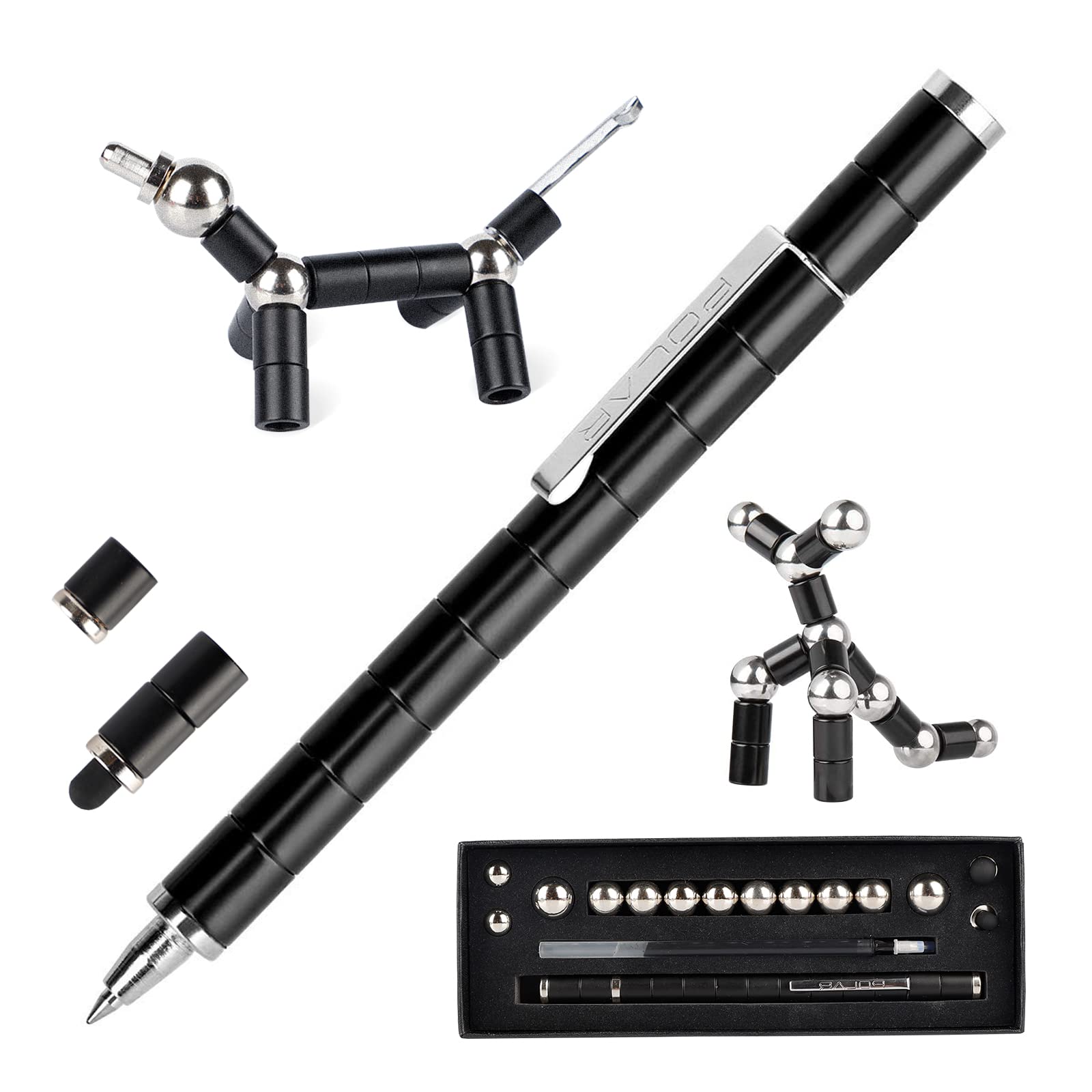 - 1x caneta magnética Fidget (13x tubos magnéticos, 2x tampas magnéticas, 1x clipe de caneta magnética, 1x cartucho de caneta de gel)