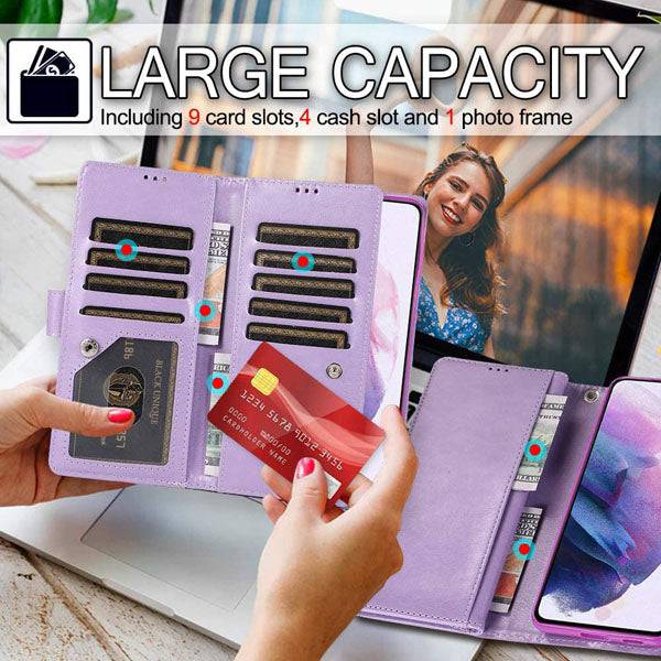 ▶ [Grande capacidade + faixa de pulso]: o interior possui 9 compartimentos para cartões, 1 bolso para moedas com zíper, 2 bolsos laterais para armazenar convenientemente sua identidade, licença, foto, dinheiro e cartões de crédito. Telefone sem complicações.