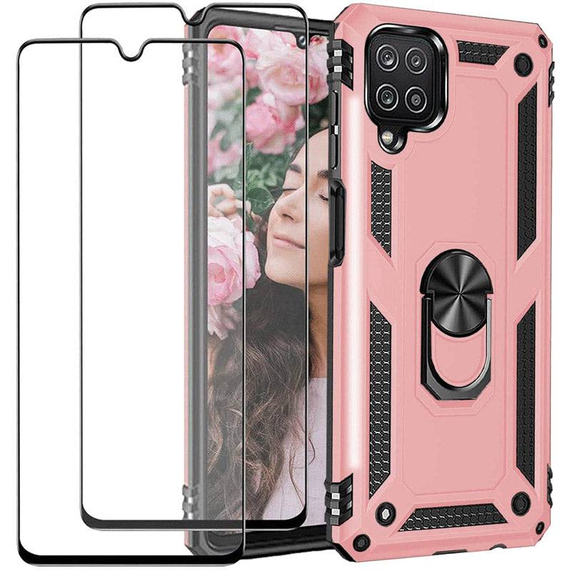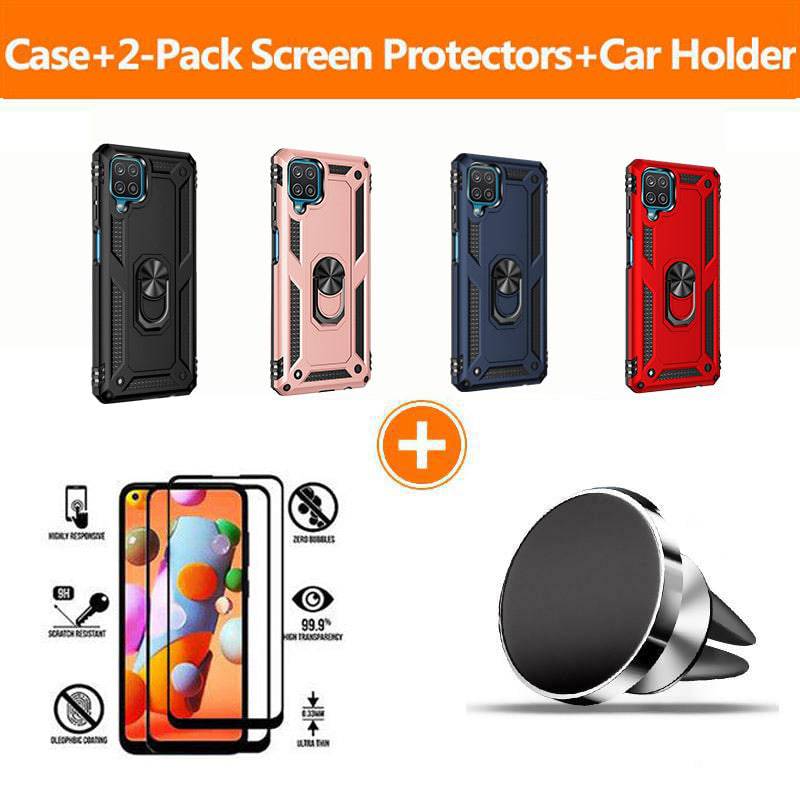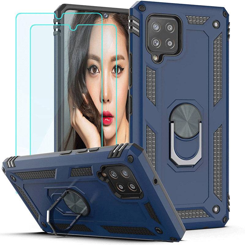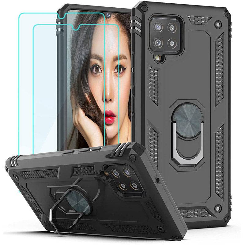 Samsung A42 (5G) Capa de telefone com suporte de anel de armadura de luxo com protetores de tela de vidro temperado de 2 pacotes