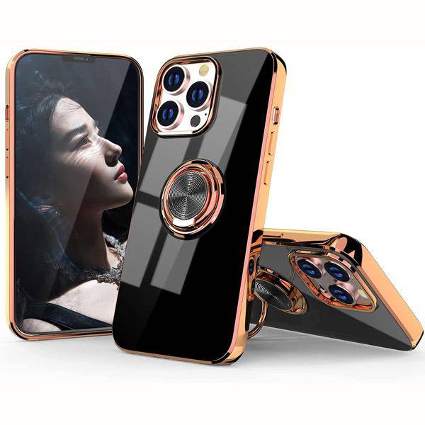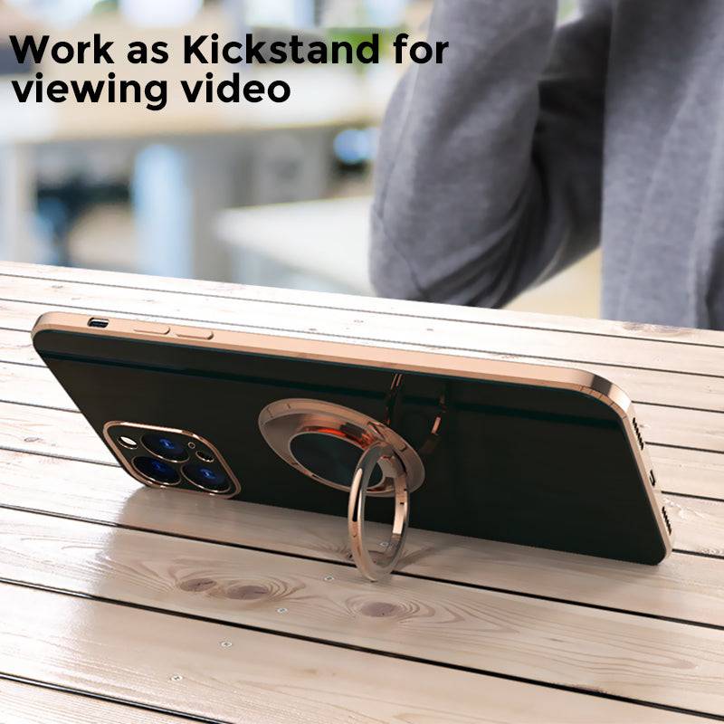 Borda em ouro rosa com revestimento brilhante e design de suporte de anel para visualização com as mãos livres, é conveniente para você assistir vídeos e filmes com conforto invejável. O centro do anel porta-dedo ali é um pedaço de ferro oculto , é fácil conectar e remover o telefone do suporte magnético para carro.